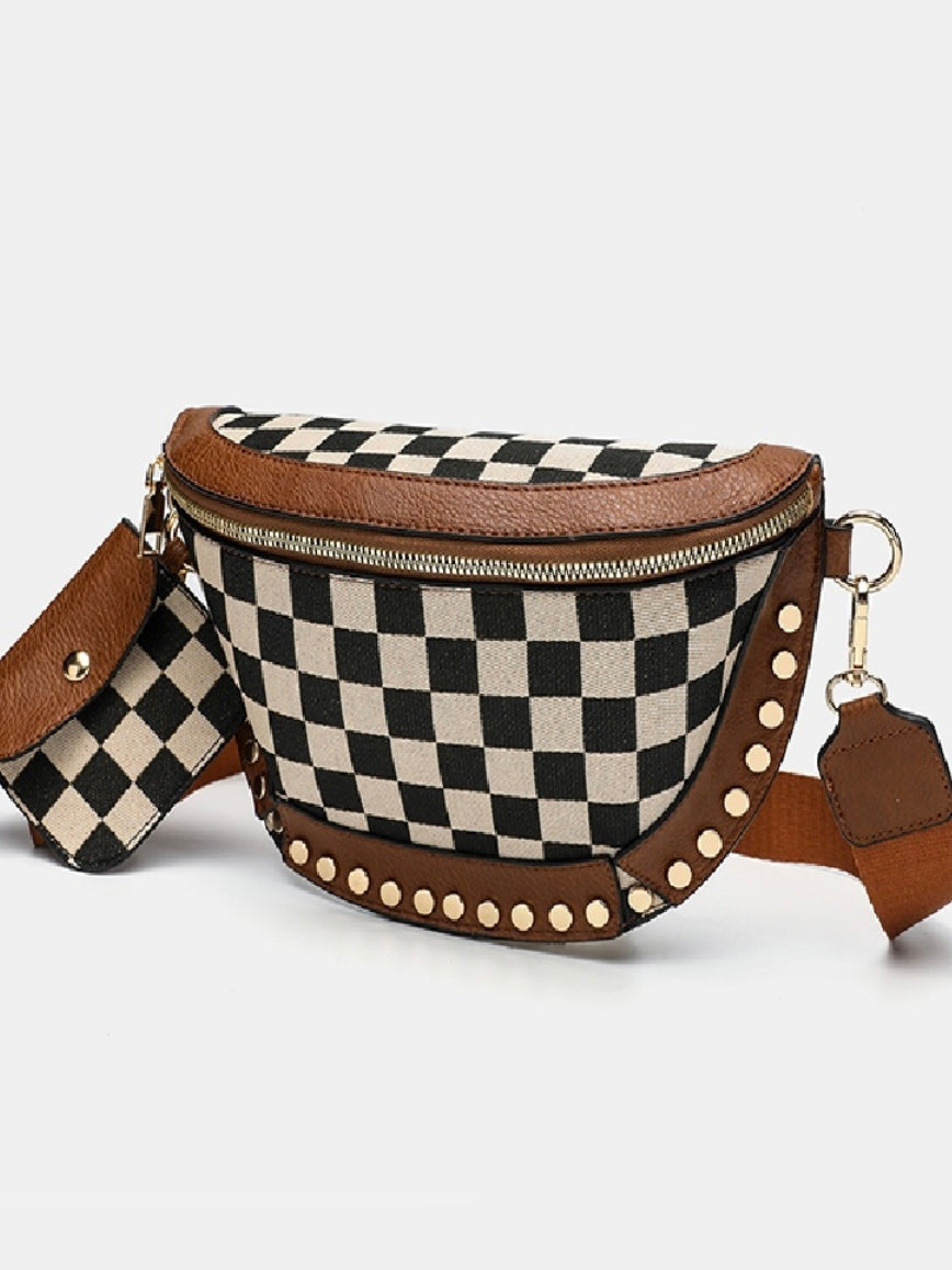 A bold, designer-inspired belt bag with a trendy checkered canvas front and warm brown trim and our fav BLACK! Finished with gold stud detailing and a curved silhouette, it’s the perfect blend of edgy and cool. The adjustable strap lets you wear it crossbody or around the waist, making it ideal for travel, concerts, errands, or everyday street-style looks.