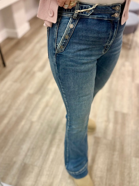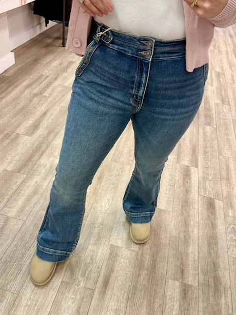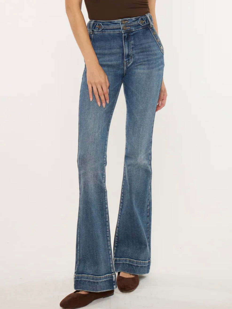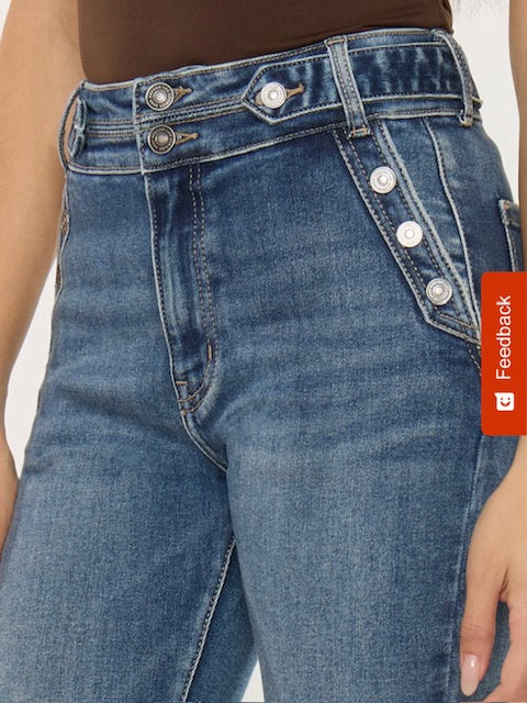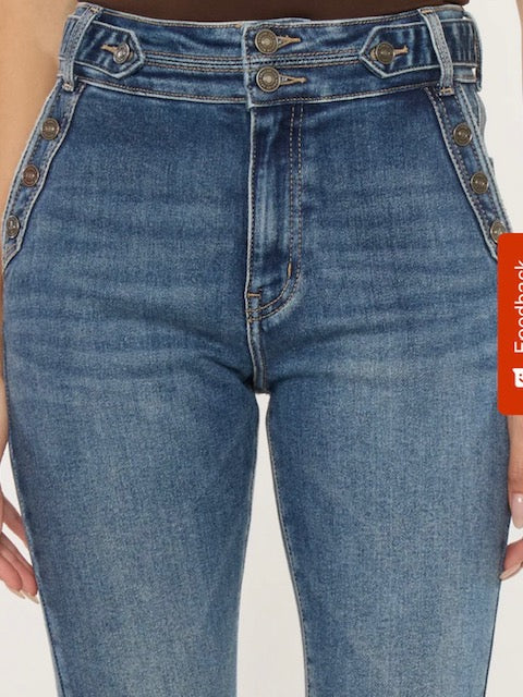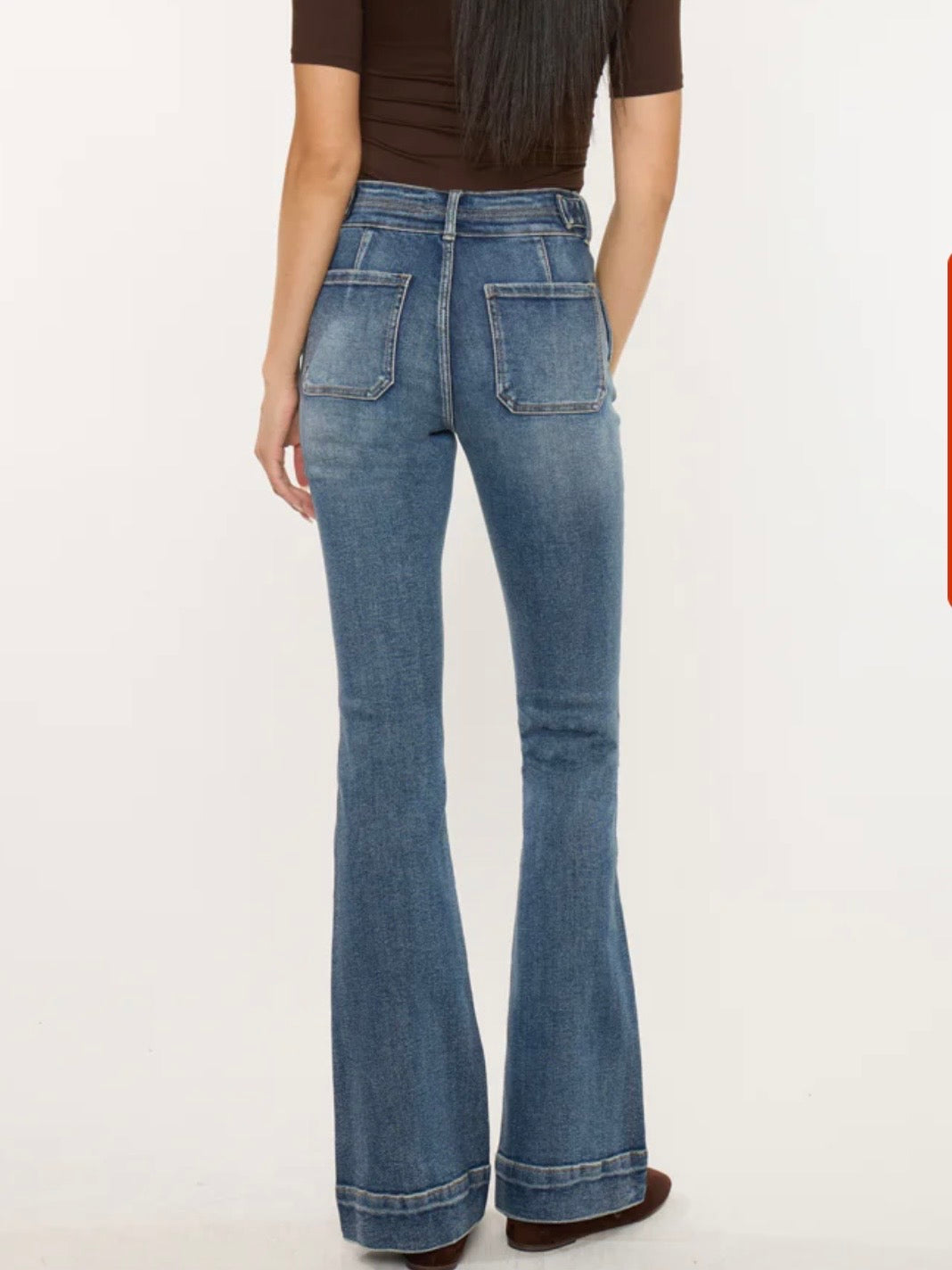 Katy High Rise Flare is a new addition to our Flare collection. In a rich dark wash colour that gives it an alluring look. Meant to sit high on the waist and give you a tight fit fell all throughout your thigh before it flares out. At the front of the jeans, we have slant pockets with a multi button closure. The 2.25" waistband has a tab button detail alongside the double button closure.