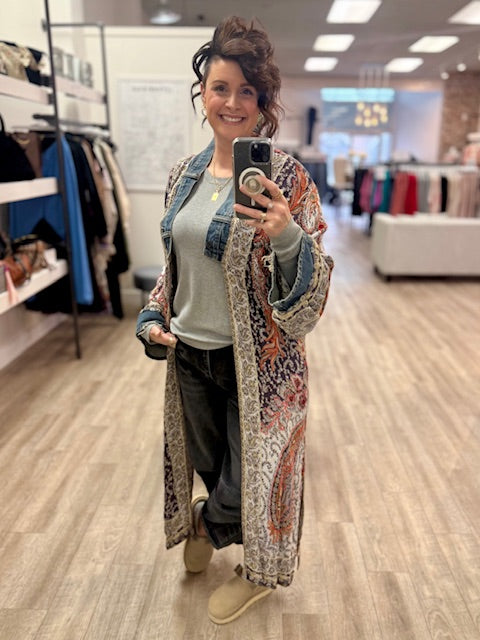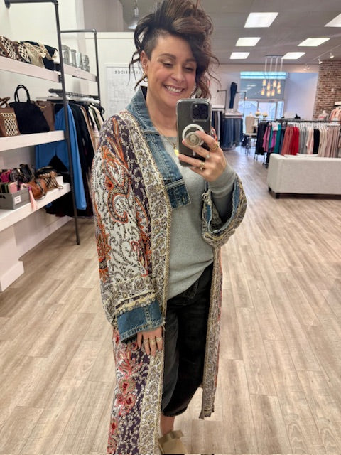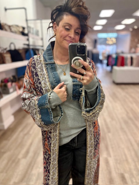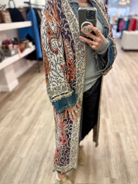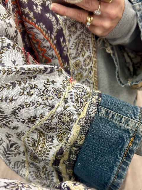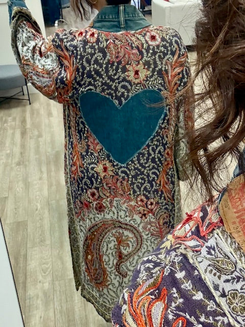 Salvaged denim and linen cotton blend, this pieces are the perfect everyday piece, wear it casually over jeans and a t-shirt, or dress it up as a statement.