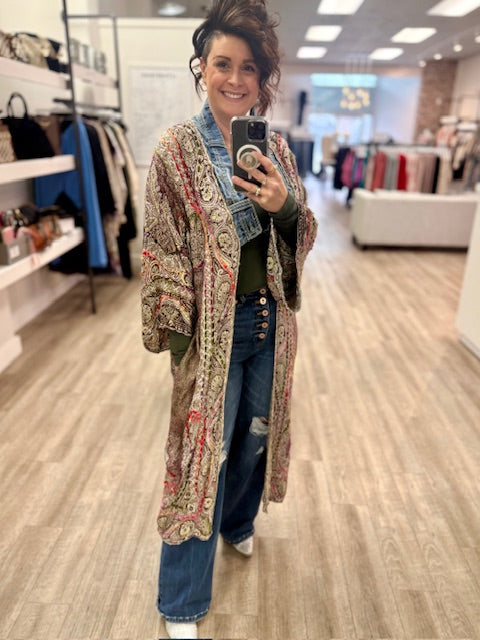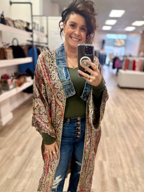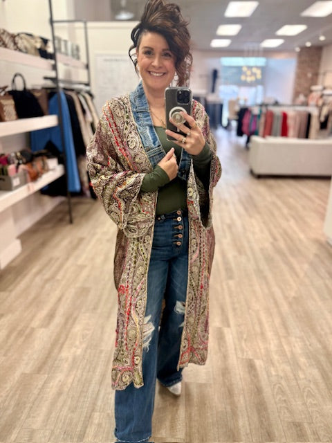 Salvaged denim and linen cotton blend, this pieces are the perfect everyday piece, wear it casually over jeans and a t-shirt, or dress it up as a statement.