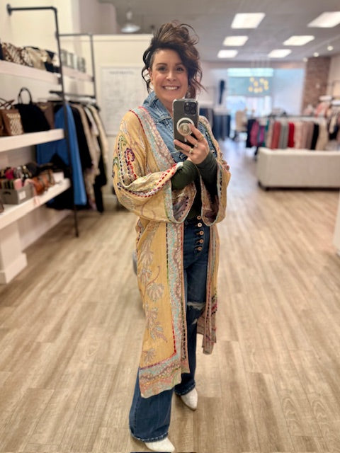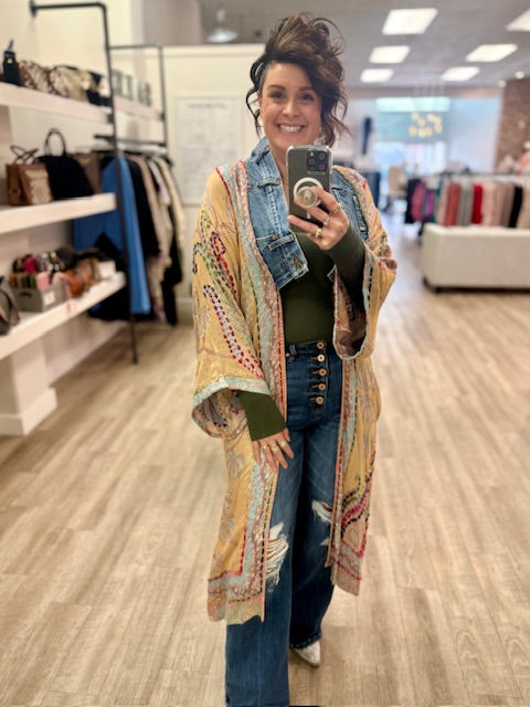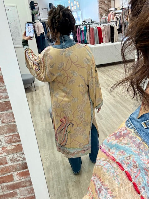 Salvaged denim and linen cotton blend, this pieces are the perfect everyday piece, wear it casually over jeans and a t-shirt, or dress it up as a statement.