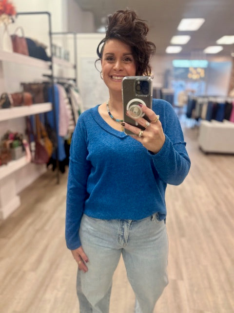 This is a SOFT ribbed V-neck sweater in a Light Navy— a very versatile and season-spanning piece. Lightweight ribbed texture – gives it a casual yet polished look and makes it easy to layer. Relaxed V-neckline with ribbed trim – flattering for layering over tanks or shirts, or on its own. Drop-shoulder, loose silhouette – lends a comfortable, laid-back drape. Straight hem – simple and easy to tuck into jeans or skirts for shape.