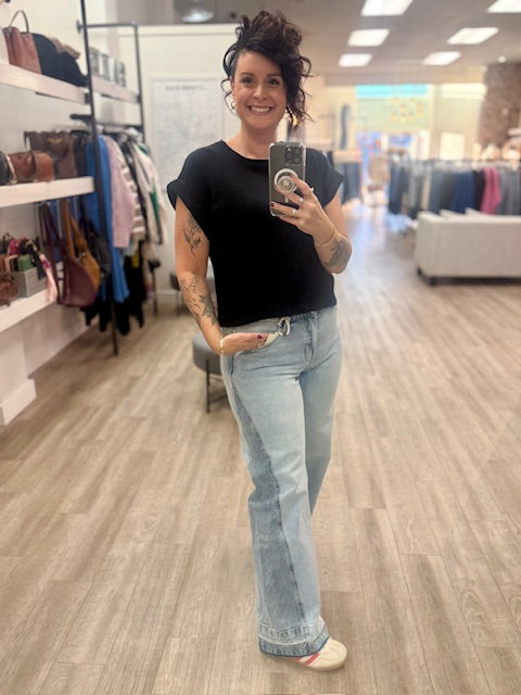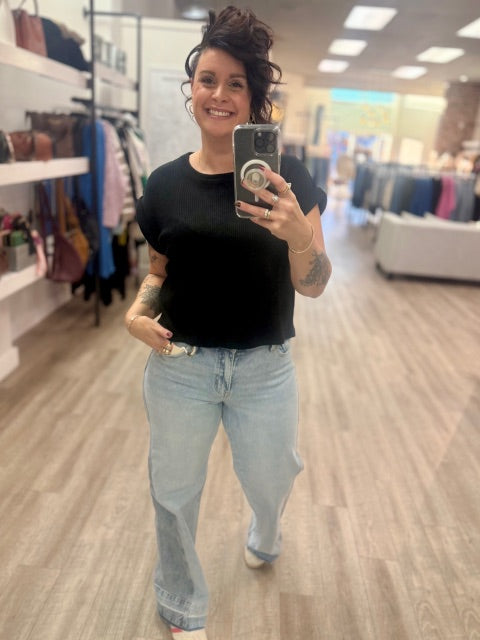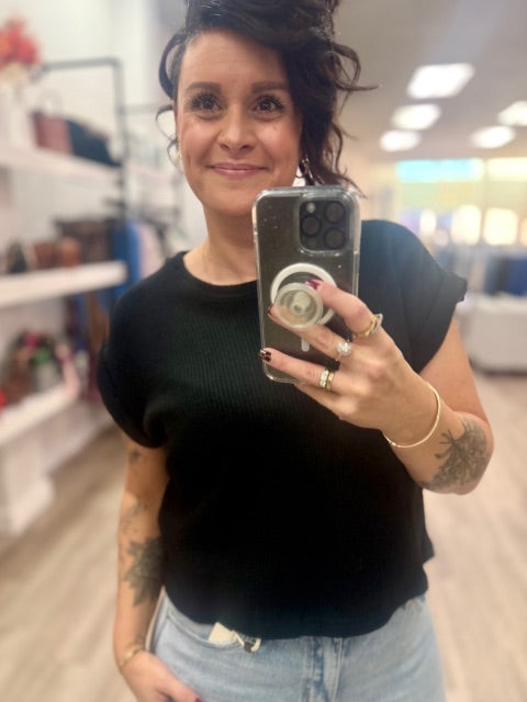This piece is a black ribbed knit cap-sleeve top — an easy essential with an elevated, textured finish. This soft knit blends comfort with casual sophistication.