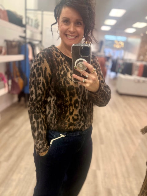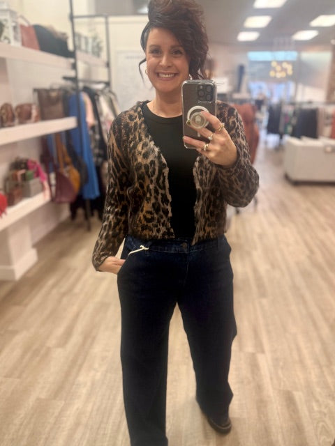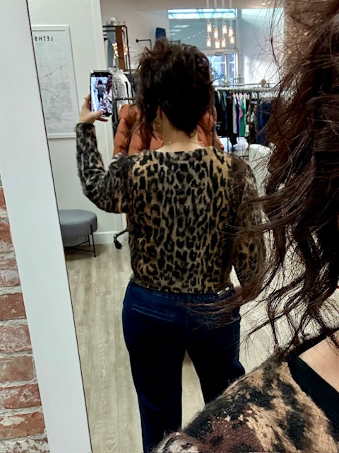 Unleash your wild side with this fierce leopard print cropped cardigan. Designed with a soft, textured knit and a deep V-neckline, it blends cozy comfort with statement-making style. The warm caramel, tan, and black tones create a rich, dynamic pattern, while the cropped cut adds a modern, flattering edge. Finished with front button detailing, this piece layers effortlessly over camis, bodysuits, or even a sleek black turtleneck for a chic, eye-catching.