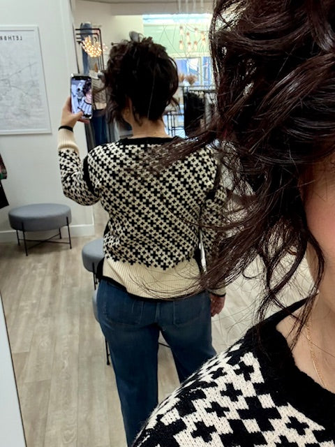 This black and cream patterned sweater By Point Zero makes a bold graphic statement while staying cozy and versatile. The geometric cross-stitch design gives it a modern twist on classic knitwear, while the ribbed crew neckline, cuffs, and hem add structure and comfort. The contrasting black side panels create a flattering, slightly tailored silhouette that elevates it beyond your average pullover.